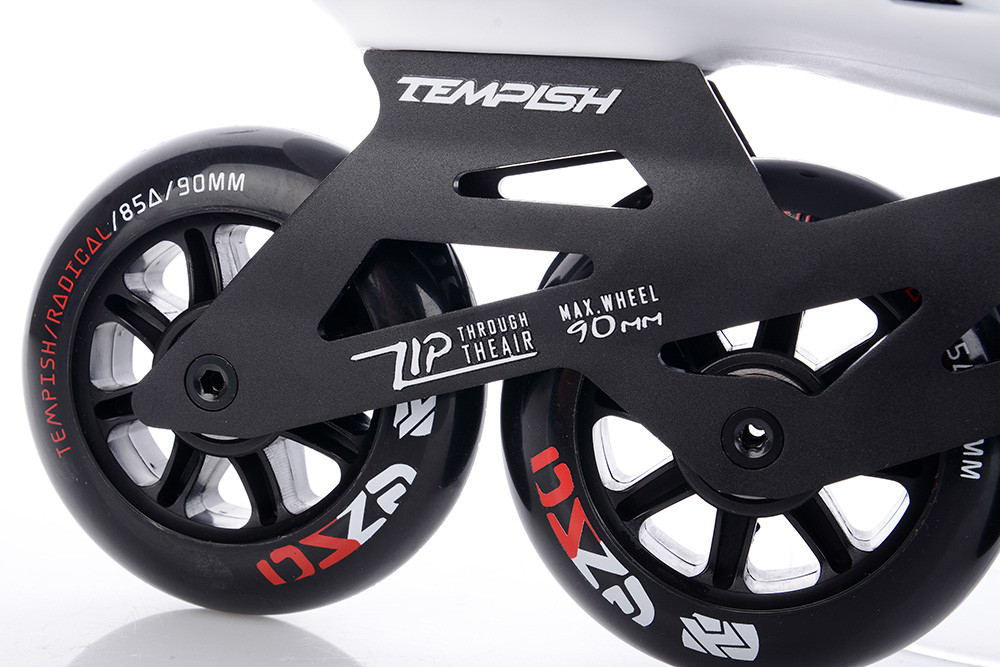 The chassis is made by CNC technology. Attachment of the chassis with central screws with the possibility of tilting the chassis off the axis - for ideal adjustment according to the skating style and different anatomical construction of the user's foot (whole leg) in the front and back. The chassis is very light but rigid. The axles are always screwed on the right side of both skates - they ensure safety - it is not possible to tow while riding.