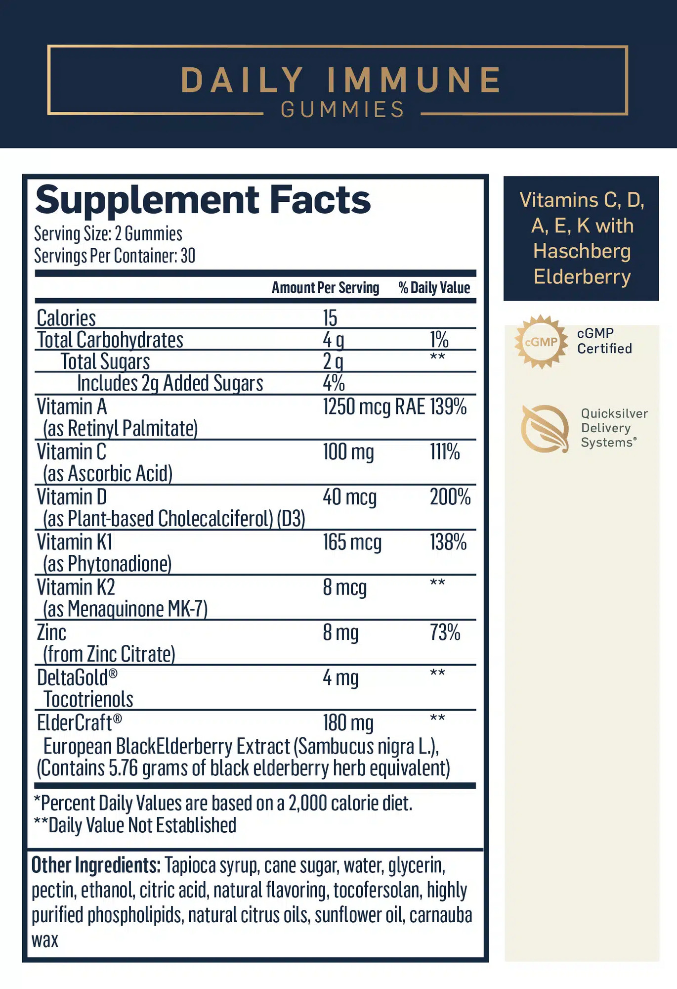 Tapioca syrup • cane sugar • water • stabiliser (glycerol) • gelling agent (pectin) • ethanol • acidity regulator (citric acid) • natural flavores • antioxidant (vitamin E (as d-alpha tocopherol polyethylene glycol 1000 succinate)) • highly purified phospholipids (lecithins) • black elderberry (Sambucus nigra L.) fruit extract • sodium ascorbate (vitamin C) • zinc citrate • orange peel oil (Citrus sinensis) • tocotrienols • retinyl palmitate (vitamin A) • cholecalciferol (vitamin D) • phylloquinone (vitamin K1) • menaquinone (vitamin K2)